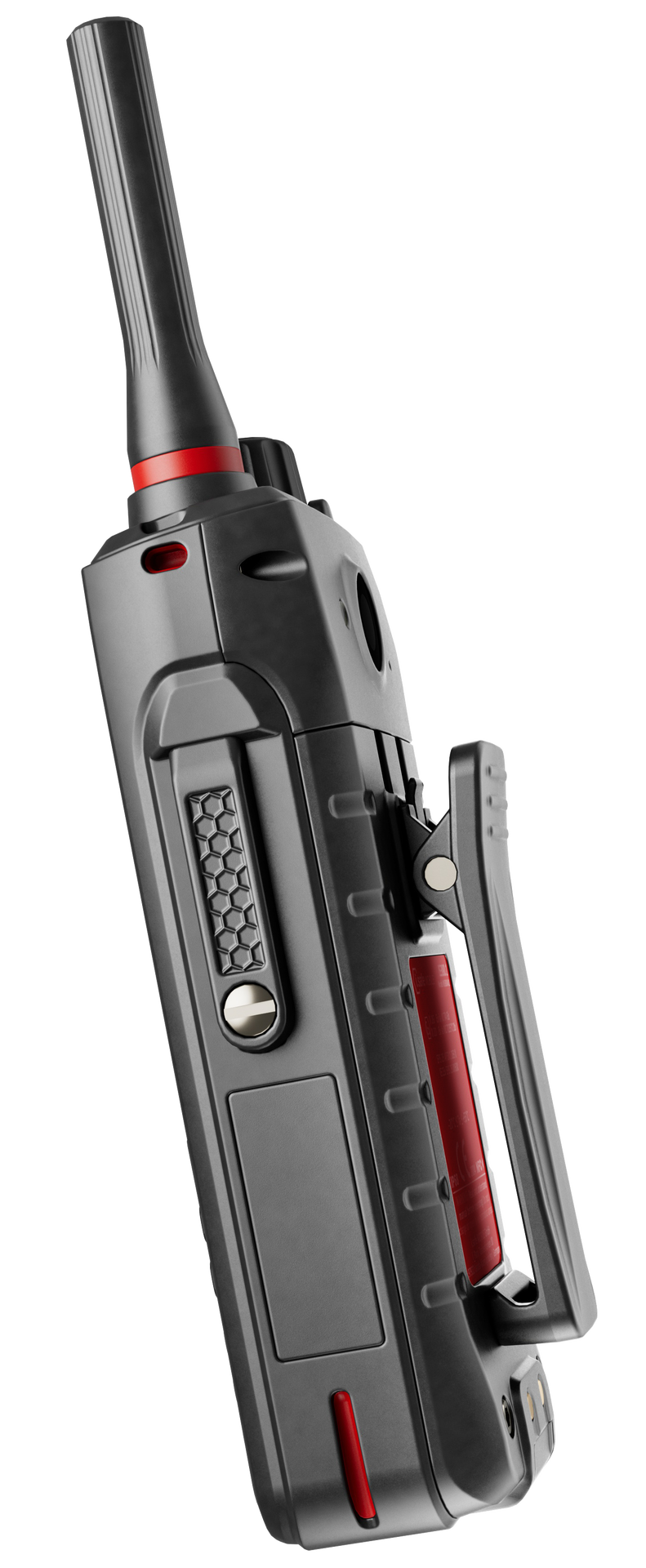 The device retains the classic two-way radio ergonomics users expect, including a large side-mounted PTT button, rotary switch for channel or volume selection, front-facing amplified loudspeaker and replaceable battery. It integrates seamlessly into existing communication ecosystems and supports professional audio accessories via the 13-pin ISM interface.